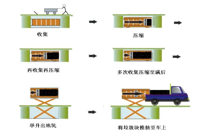 水平式生活垃圾壓縮中轉(zhuǎn)設(shè)備是將垃圾的卸(出)料、壓縮、儲(chǔ)存集合在一起,整體落于地下,利用地下空間將垃圾密閉在箱體內(nèi),地面上無垃圾外露現(xiàn)象,壓縮垃圾產(chǎn)生的污水經(jīng)排污管道直接流入污水井內(nèi),然后由污水泵排到城市污水管網(wǎng),徹底解決了垃圾在收集、儲(chǔ)存、裝運(yùn)過程中的污染環(huán)境、作業(yè)效率低等問題。整個(gè)設(shè)計(jì)僅有上蓋板露出地面,上蓋板可與周圍環(huán)境協(xié)調(diào)裝飾,達(dá)到融為一體的效果,使城市面貌更加美觀。