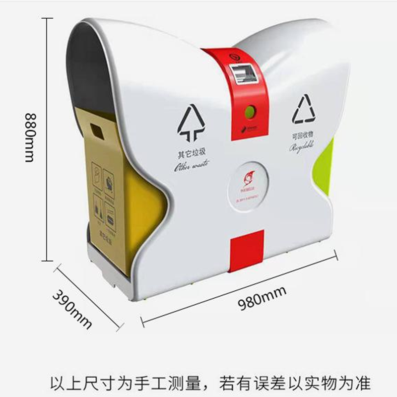 4.側(cè)板文字標(biāo)識采用絲網(wǎng)印刷,印刷有“可回收物” “其他垃圾”,分類標(biāo)識參照《城市生活垃圾分類標(biāo)識》規(guī)定的名稱、圖形、符號和顏色要求,LOGO可定制。